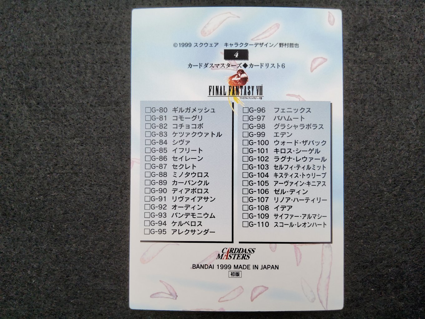 Collection de 72 cartes qui est la première partie de Final Fantasy VIII Carddass Masters, la seconde partie étant les 110 cartes Triple Triad.