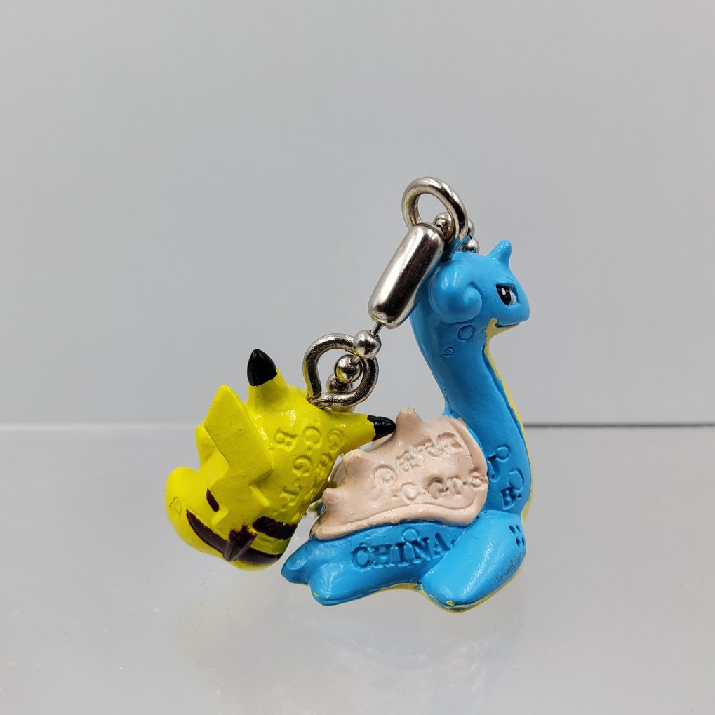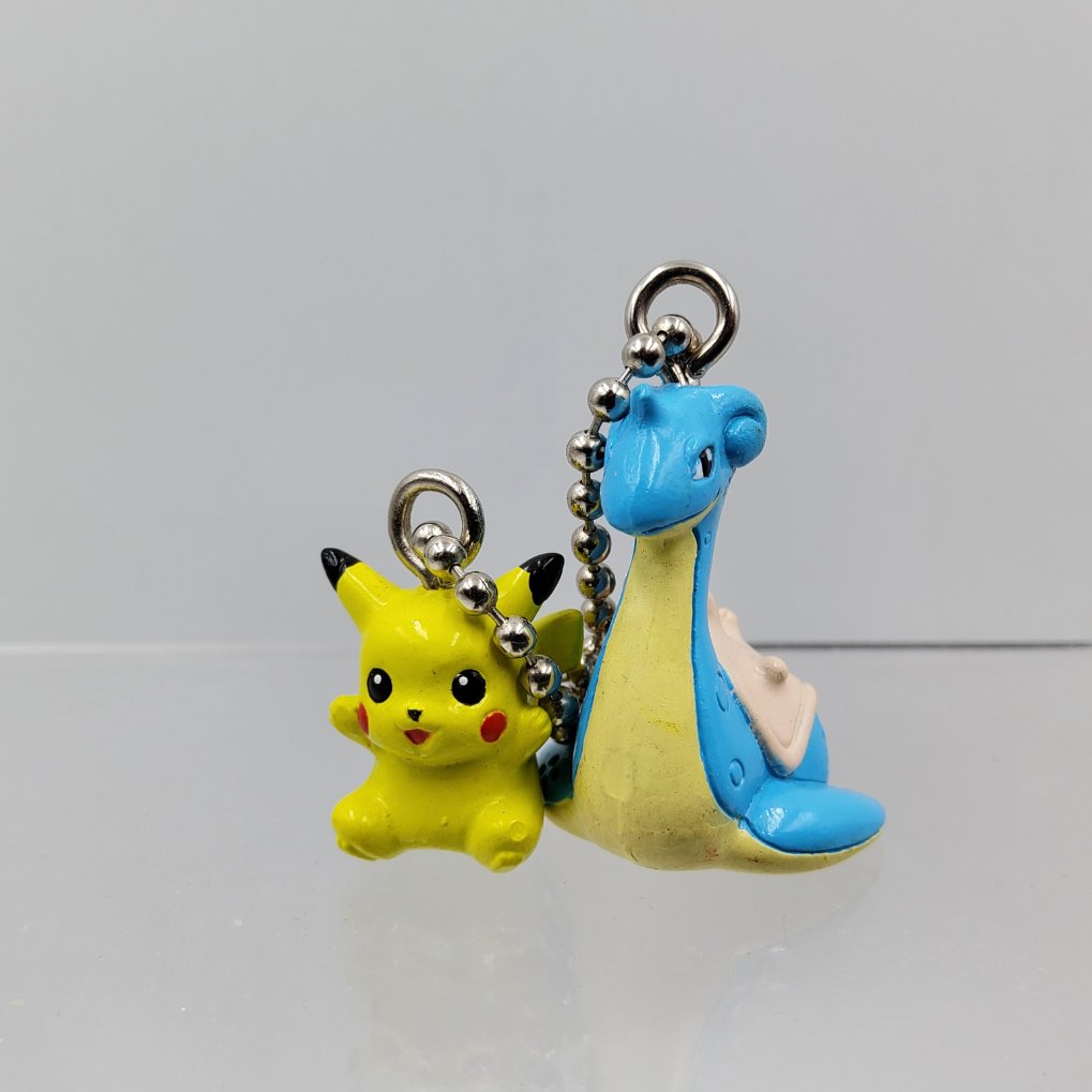 Figurines officielles de Pikachu et Lokhlass avec une chaîne en porte-clé, appartenant à la collection Pokemon Swing.