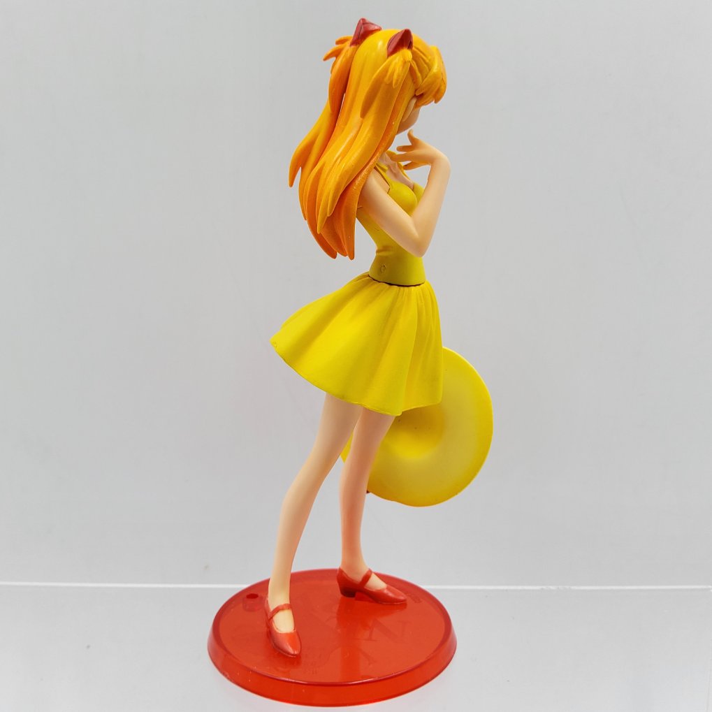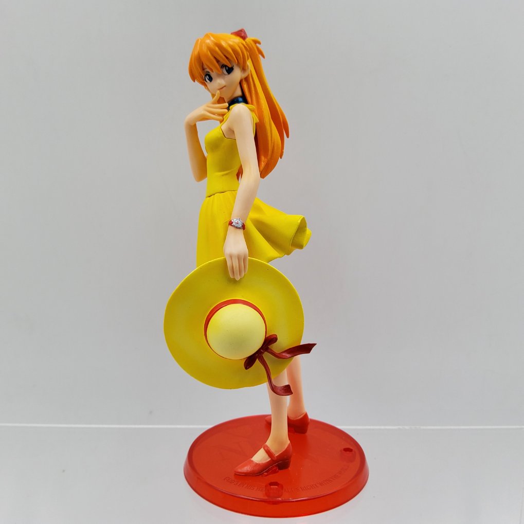 Figurine d’Asuka Langley Soryu dans sa robe jaune iconique de l’anime Neon Genesis Evangelion de Hideaki Anno, produite par Bandai et sortie uniquement au Japon en 2007.