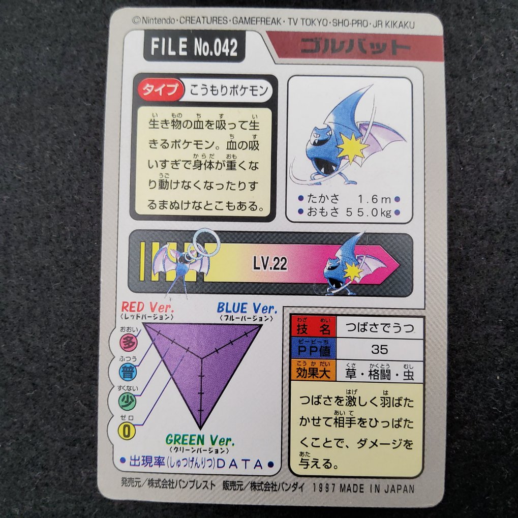 Carte Pokemon officielle de Nosferalto, appartenant à la collection Pocket Monsters Carddass Trading Cards produites par Bandai en 1997. Sortie uniquement au Japon.