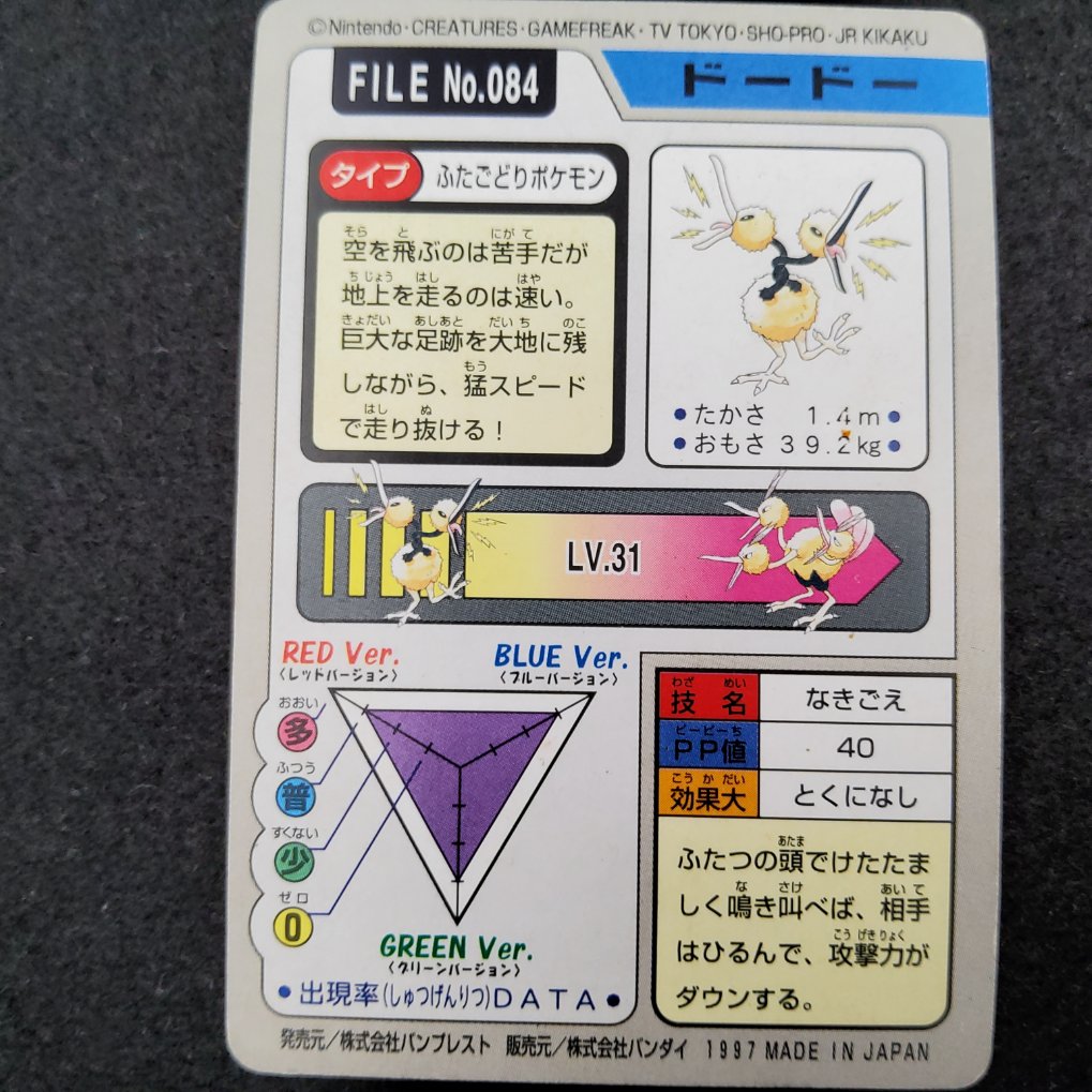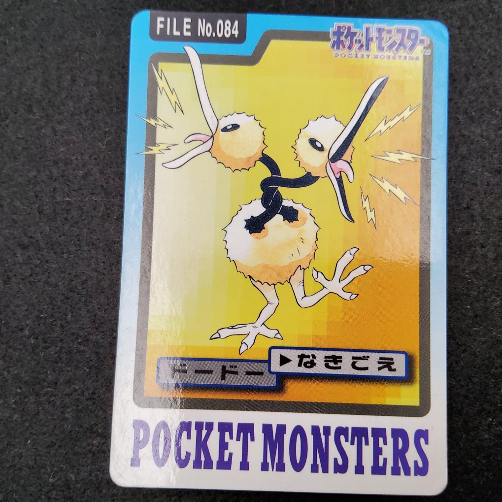 Carte Pokemon officielle de Doduo, appartenant à la collection Pocket Monsters Carddass Trading Cards produites par Bandai en 1997. Sortie uniquement au Japon.