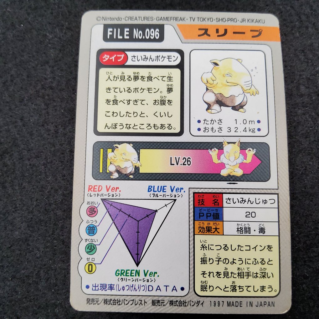 Carte Pokemon officielle de Soporifik, appartenant à la collection Pocket Monsters Carddass Trading Cards produites par Bandai en 1997. Sortie uniquement au Japon.