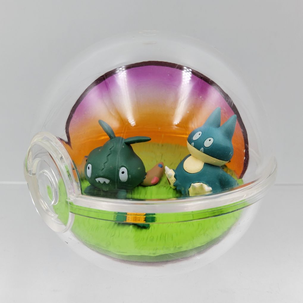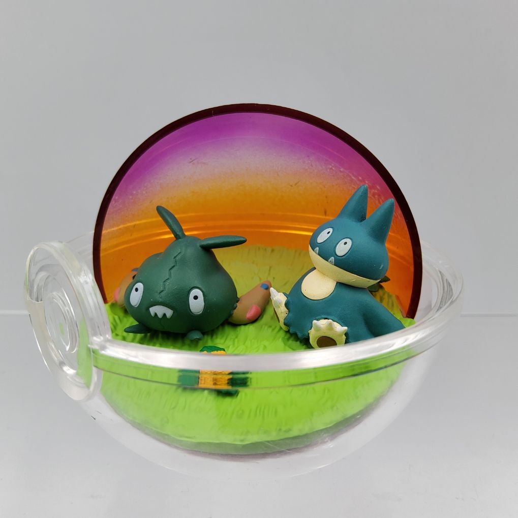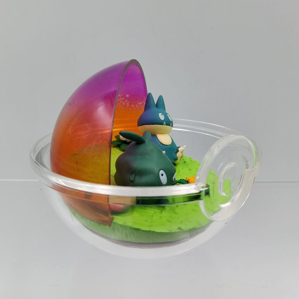 Figurines Pokemon de Miamiasme et Goinfrex produites par Re-Ment appartenant à l’édition Terrarium Collection Relax Time.